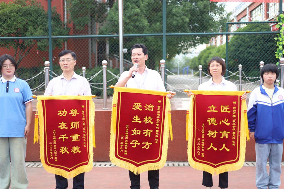 在拜師禮這一莊重環節圓滿結束后,現場迎來了一個特別的時刻—學生代表與家長代表共同走上臺前,向賴赴權校長贈送錦旗。錦旗上繡著“治校有方,愛生如子”等字樣,表達了學生對學校領導層辛勤付出的認可與感激,也彰顯了家校共育的深厚情誼。